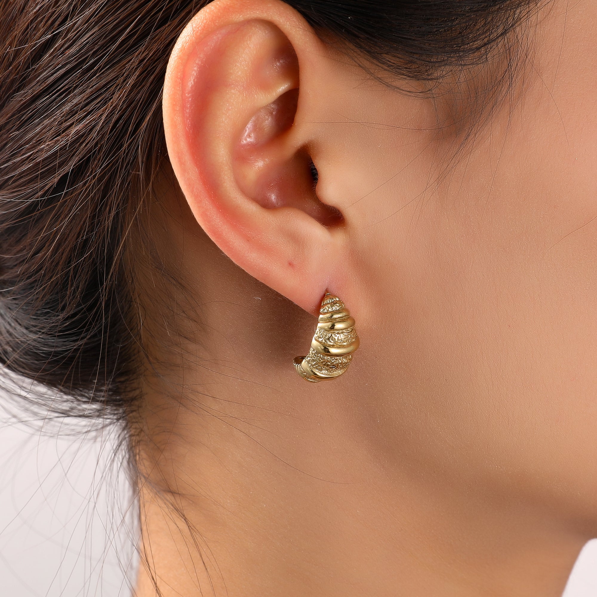 Trendy Day & Eve Croissant Drop oorbellen in goudkleur met een stijlvol, getextureerd croissantdesign. Met een afmeting van 19 mm x 10 mm zijn ze een echte eyecatcher, perfect om je outfit een modieuze twist te geven.