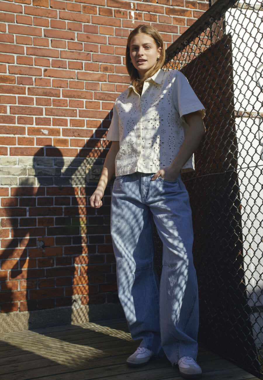 ELSANA-SH is een unieke en stijlvolle blouse met een luchtig, geperforeerd patroon. De blouse heeft een klassieke overhemdkraag en knopen aan de voorkant. De blouse heeft een comfortabele pasvorm en korte mouwen